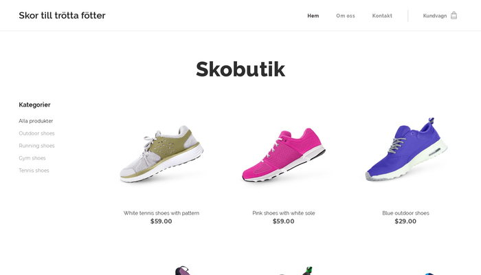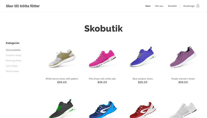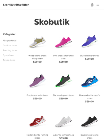 Låt din skobutiks kunder handla på nätet med vår helt nya mall. Organisera dina produkter i olika kategorier, lägg till beskrivningar och sälj dem på nolltid med din helt nya webbshop.