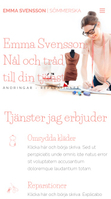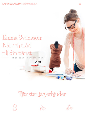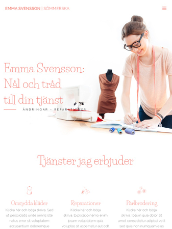 Denna ljusa mall är skräddarsydd för sömmerskor och skräddare. Dess innovativa typsnitt gör utseendet unikt och sticker ut från mängden. Dra nytta av den välorganiserade tjänst-sidan för att beskriva de tjänster du erbjuder, kontaktinformation, foton av ditt arbete och din hemsida är klar för lansering på ett ögonblick.