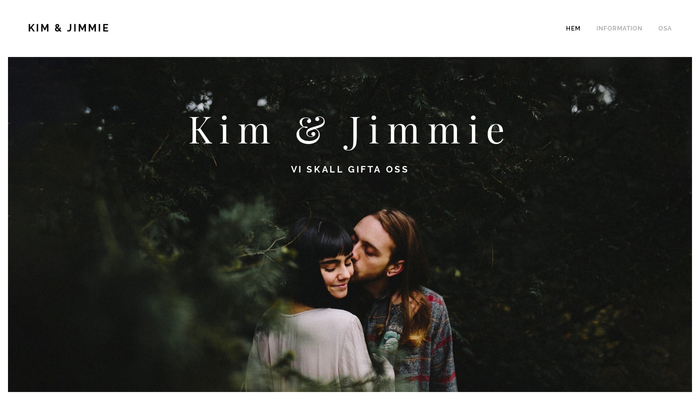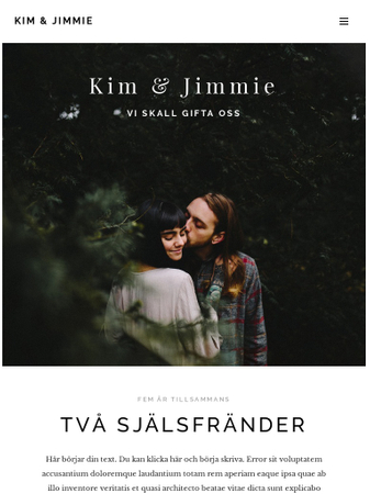 Letar ni efter en unik mall för er bröllopshemsida? Ni har hittat den! Spännande typsnitt och djärva bilder gör detta till den perfekta mallen för ert fantastiska bröllop. Lägg in plats, svar och frågor, eller ett OSA-formulär och visa familj och vänner hur enastående bröllopet kommer att bli.