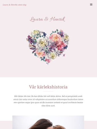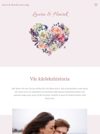 Ljuvlig mall med glada pastellfärger och hjärtan. Låt familj och vänner veta att ni skall gifta er, och dela med er av viktig information om bröllopet. Alla kommer att bli förväntansfulla och längta till bröllopet när de ser hemsidans härliga design. Det enkla OSA-formuläret gör det lätt att organisera bröllopsgästerna.