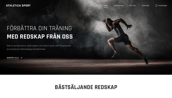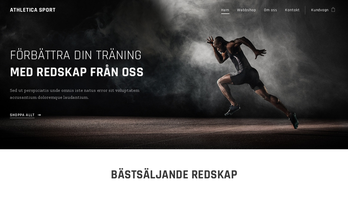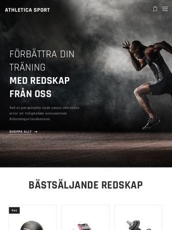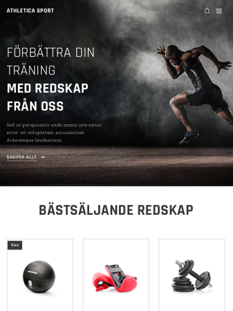 Denna stiliga webbshopsmall gör det lätt att sälja gymutrustning, träningskläder och kosttillskott. Visa allt dina besökare behöver veta om produkterna och webbshopen förvandlar dem till kunder.