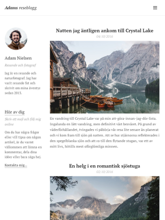 Packa din resväska! Du kan enkelt dela med dig dina reseäventyr med denna mall. Skriv om dina erfarenheter, lägg till bilder och låt din hemsidas besökare resa till dina favoritplatser i deras fantasi. Denna välstrukturerade mall lyfter fram dina berättelser och bilder.