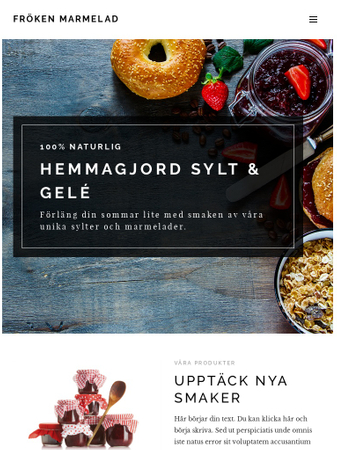 Denna mall är som skapad för dig som älskar att koka sylt, göra saft eller egen inlagd sill. Sidhuvudets nya utformning gör att hemsidan verkligen sticker ut. Presentera dina produkter, berätta om din verksamhet och se till att besökare får reda på hur de får tag på dina produkter. Att visa fram sina talanger online har aldrig varit enklare.