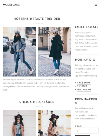 En mall för designers och modebloggare. Enkel och stilig design lägger fokus på bilder. Presenterar kläder, accessoarer och bilder från modevisningar. Den välorganiserade startsidan hjälper dina besökare att hitta rätt till olika delar av din blogg.