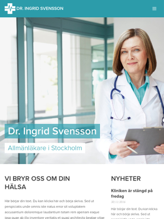 Sofistikerad design och välorganiserat innehåll för läkare och specialister. Informera dina patienter om öppettider och dela med dig nyheter från din mottagning. Presentera all information om din mottagning för dina besökare i denna snygga mall.